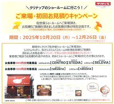 【クリナップ】ご来場・初回お見積りキャンペーン 開催中~12月26日(金)ご来場・初回お見積りキャンペーン佐世保ショールームへご来場頂き、お見積りご依頼を頂きましたお客様対象の特別企画です。 → 詳しくはこちら