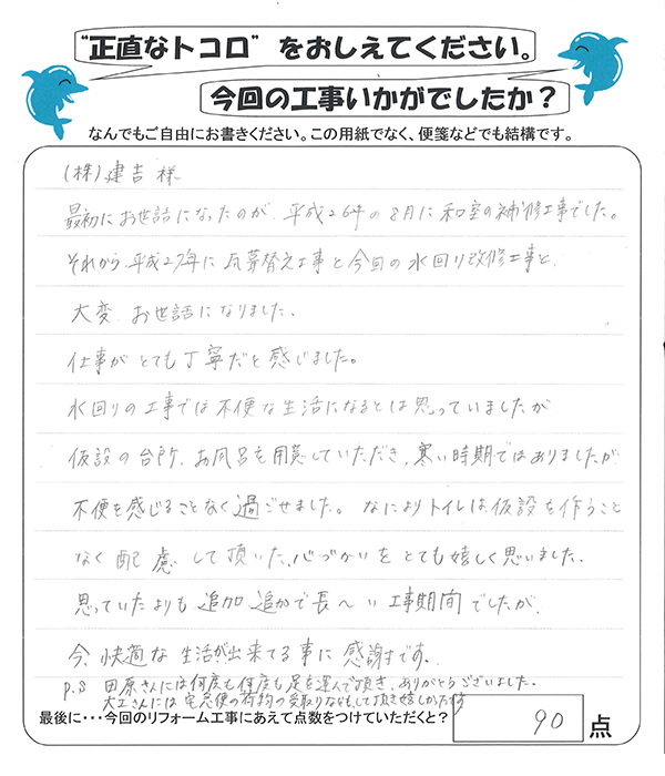 それから平成27年に瓦葺替え工事と今回の水回り改修工事と大変お世話になりました。