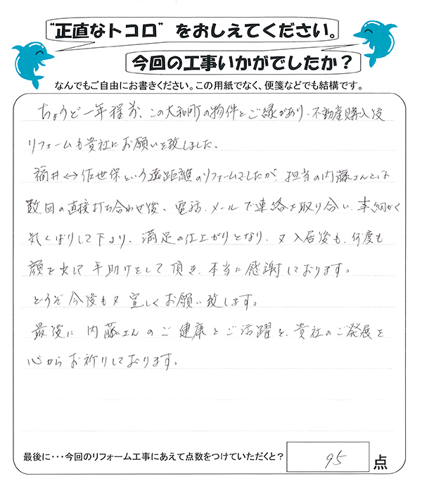 福井↔︎佐世保という遠距離のリフォームでしたが、担当の内藤さんとは数回の直接打ち合わせ後、電話、メールで連絡を取り合い、本細かく気くばりして下さり、満足の仕上がりとなり、又、入居後も何度も顔を出して手助けをして頂き、本当に感謝におります。