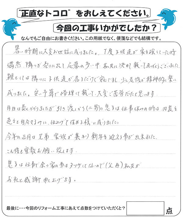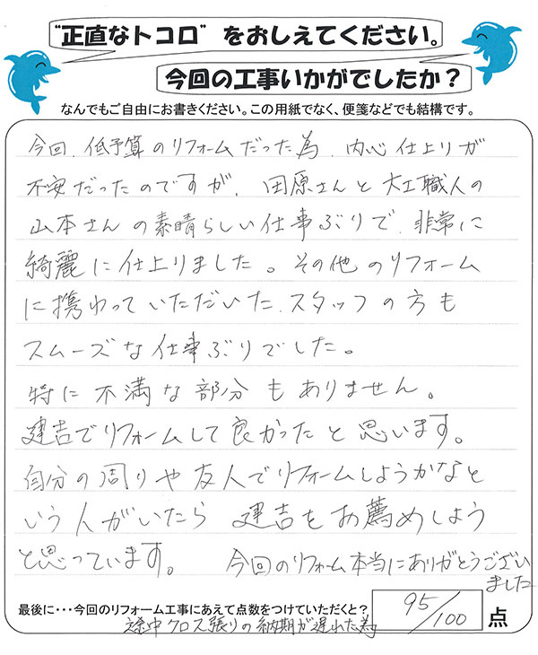 リフォームに関しても、少ない予算であった為最初のお見積りよりもかなり削った内容になりましたが、細かい注文にも応えて頂き感謝しております。