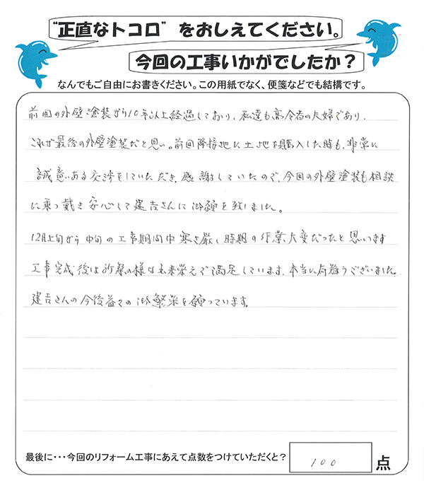 これが最後の外壁塗装だと思い。前回降接地に土地を購入した時も、非常に誠意ある交渉をしていただき、感謝していたので、今回の外壁塗装も相談に乗って戴き安心して建吉さんに御願いを致しました。