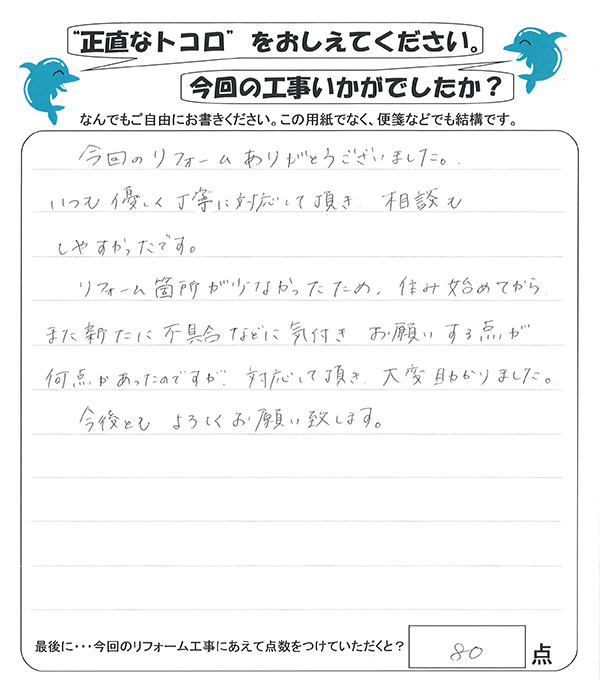 リフォーム箇所が少なかったため、住み始めてからまた新たに不具合などに気付きお願いする点が何点かあったのですが、対応して頂き、大変助かりました。