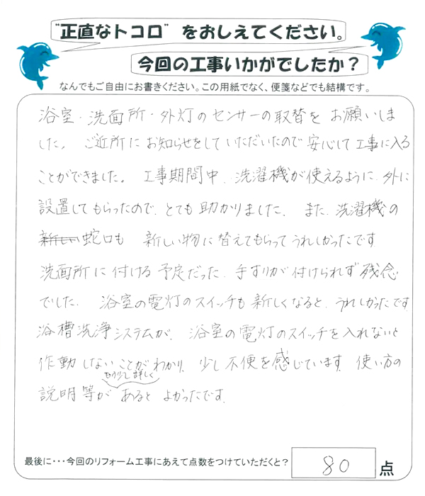 予定になく私の依頼により、イレットペーパーの取り付け工事までしていただき、感謝しております。