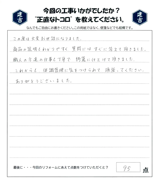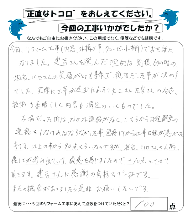 不満だった所は、なかなか連絡がなく、こちらから日程調整の連絡をしなければならなかった事、連絡してからの工事日程が急だった事です。以上の事から90点くらいなのですが、担当、川口さんの人柄、優しさが滲み出ていて、誠意を感じましたので、+10点とさせて頂きます。建吉さんに感謝の気持ちで一杯です。
