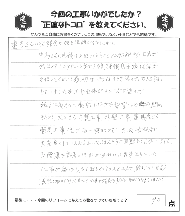建吉さんの相談会に娘と孫娘が行ってくれて、中島さんに見積を出してもらって、10月28日から工事が始まって(2ケ月の予定で)娘、孫娘、息子嫁さん達が手伝ってくれて、最初はどうなるかと皆んなで心配していましたが、工事全体がスムーズに進んで、娘も中島さんに電話しながら要望など聞いてもらって、大工さん内装工事、外壁工事、建具屋さん、電気工事、他工事に携わって下さった皆様方に、大変良くしていただきました。